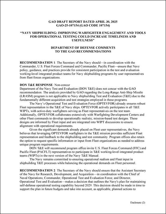 [58]GAO, Navy Shipbuilding: Improving Warfighter Engagement and Tools for Operational Testing Could Increase Timeliness and Usefulness, GAO‑25‑107543SU (Washington, D.C.: Sept. 29, 2025).