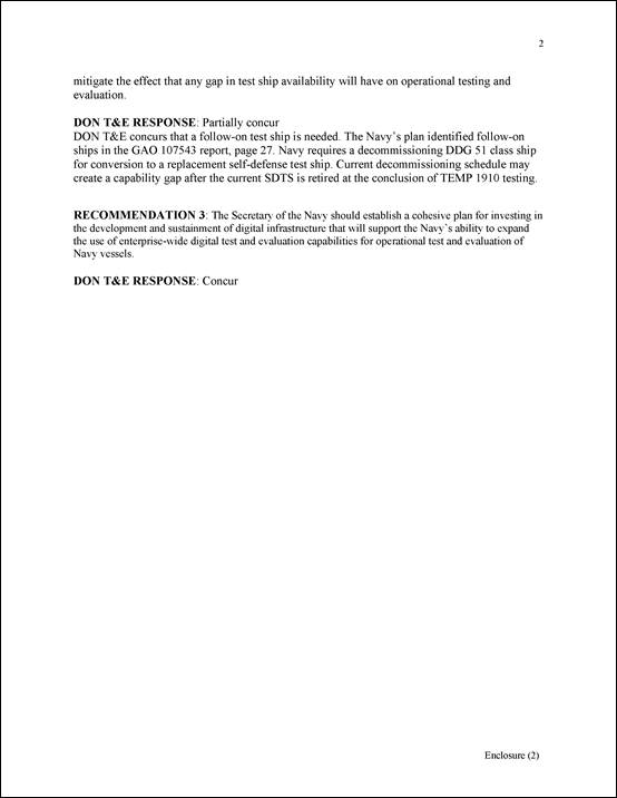 [57]Specific information from our evaluation of the Navy’s comments on our recommendation related to the self-defense test ship is omitted from this public version of GAO‑25‑107543SU, a sensitive report we issued in September 2025. The information is omitted because DOD determined that it is controlled unclassified information.