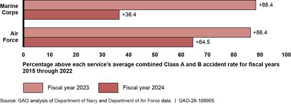 In our December 2025 report, we found that reported Marine Corps and Air Force accident rates for the most serious Osprey accidents (i.e., Class A and B accidents) increased in fiscal years 2023 and 2024 and exceeded the average serious accident rate for the previous 8 fiscal years.[5] These accidents involved death; permanent disability; extensive hospitalization; property damages of $600,000 or more; or a destroyed aircraft. Specifically, the rates of Marine Corps and Air Force serious accidents were between 36 percent and 88 percent higher than each service’s average rate for fiscal years 2015–2022 (see fig. 1). The Navy had not experienced a Class A or Class B accident with its Osprey variant since it began operational use in fiscal year 2021 through fiscal year 2024.