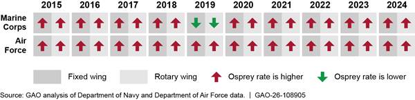 Further, the Osprey’s combined Class A and B accident rate generally ranked among the highest year over year, when compared to other individual aircraft types, according to our analysis. For example, the Marine Corps Osprey was among the top 10 highest combined Class A and B accident rates across 21 selected Department of the Navy aircraft in 9 of the 10 years of data we analyzed. Regarding the Air Force Osprey, it had the highest combined Class A and B accident rate across 37 Air Force aircraft types in 5 of the 9 years of data we analyzed.