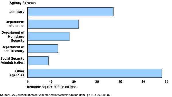 [4]We used GSA’s fiscal year 2025 Agency Financial Report to present data on tenant agency contributions to the Building Fund. This public report describes how GSA used its resources for the year. We also used data from GSA’s fiscal year 2024 State of the Portfolio to present data on the amount of rentable space tenant agencies occupy in GSA-owned buildings. The report provides an overview and relevant data for real property assets under GSA’s custody and control. According to GSA officials, these data are used to provide annual reports to Congress.