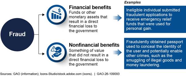 The federal government is a major target for fraud. Fraud schemes are wide-ranging and occur when something of value is obtained through willful misrepresentation. For example, receiving a benefit or assistance from the federal government by lying to meet eligibility requirements is a fraudulent act. Fraud can include financial and nonfinancial benefits, which can have both financial and nonfinancial impacts (see fig. 1).