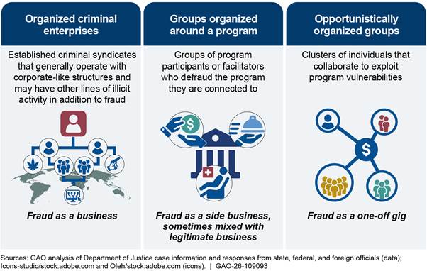 Organized fraud groups that target government programs generally fall into three types and vary in size, structure, and participants. As discussed in our July 2025 report, the types are (1) organized criminal enterprises, (2) groups organized around a program, and (3) opportunistically organized groups (see fig. 2).[32]
